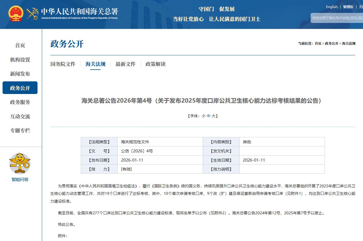 海關(guān)總署公告2026年第4號(關(guān)于發(fā)布2025年度口岸公共衛(wèi)生核心能力達標考核結(jié)果的公告)