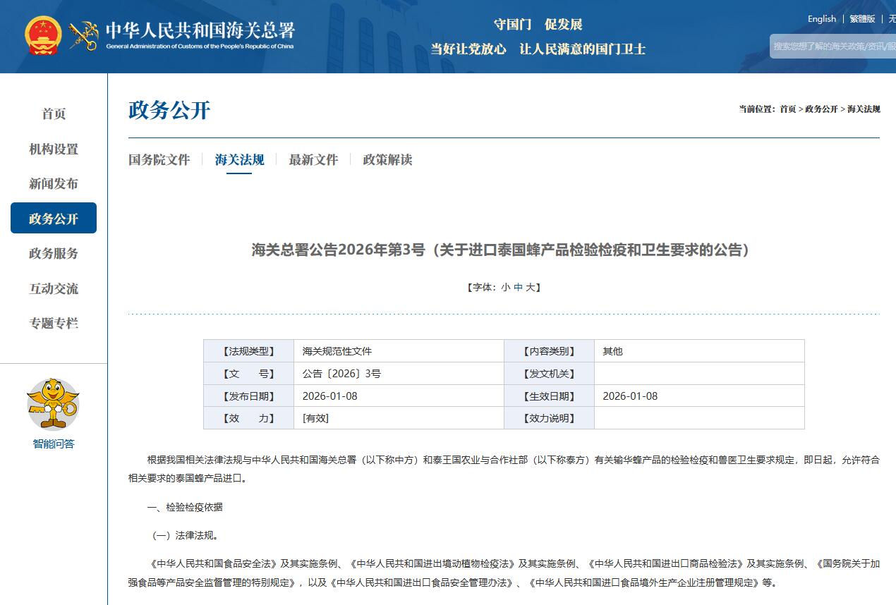 海關(guān)總署公告2026年第3號(關(guān)于進口泰國蜂產(chǎn)品檢驗檢疫和衛(wèi)生要求的公告)