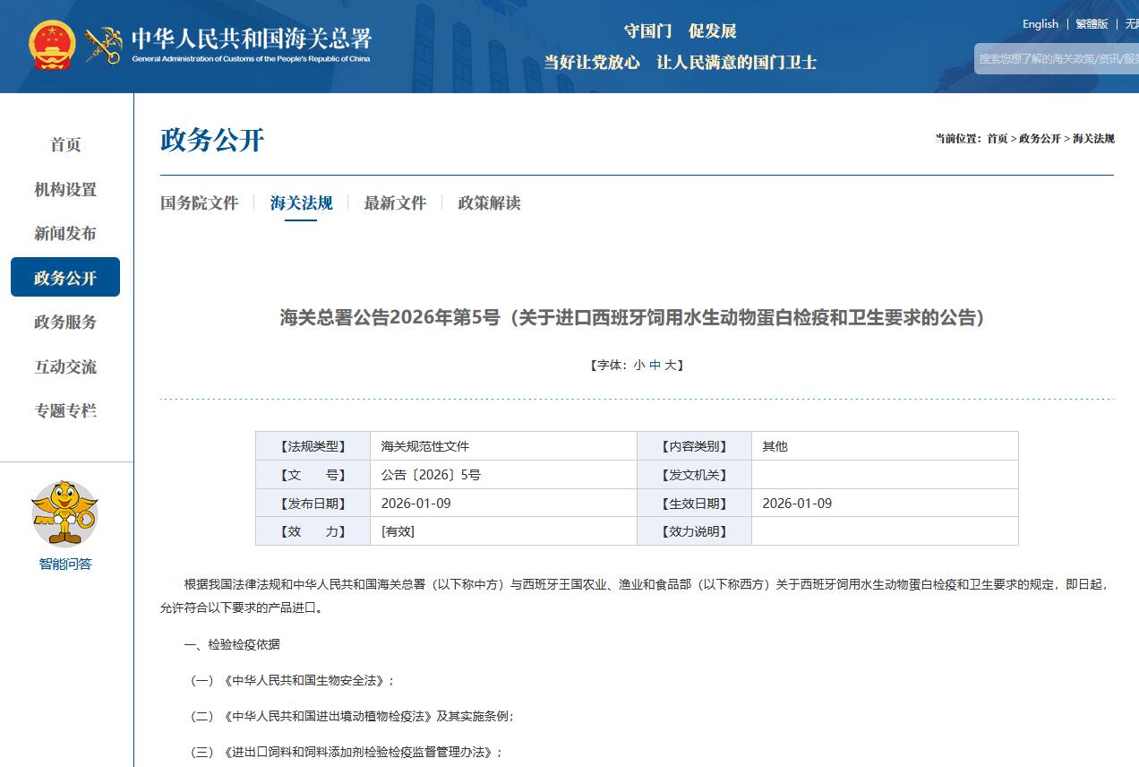 海關(guān)總署公告2026年第5號(關(guān)于進口西班牙飼用水生動物蛋白檢疫和衛(wèi)生要求的公告)
