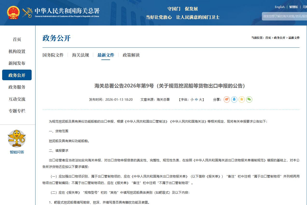 海關(guān)總署公告2026年第9號(關(guān)于規(guī)范挖泥船等貨物出口申報的公告)