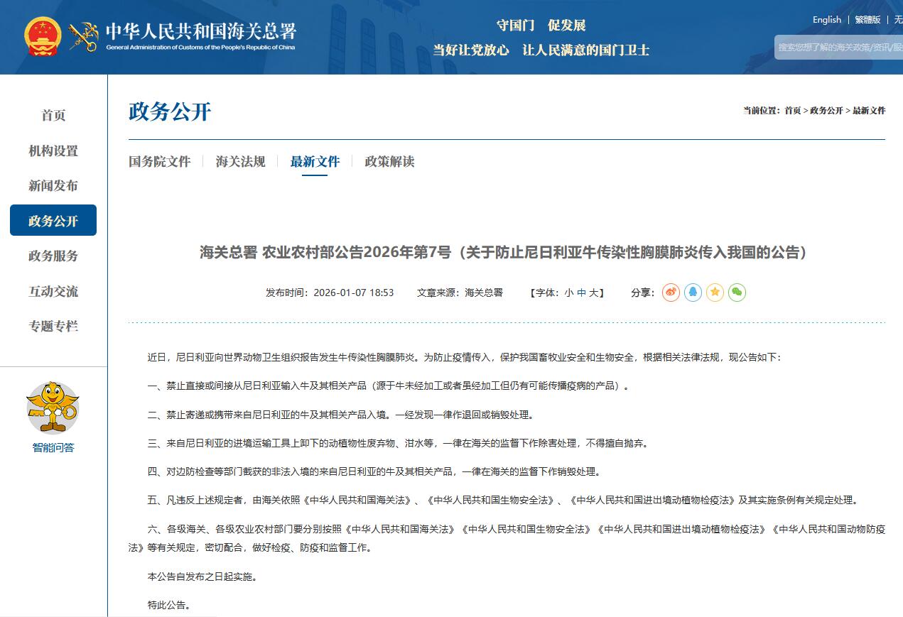 海關(guān)總署 農(nóng)業(yè)農(nóng)村部公告2026年第7號(關(guān)于防止尼日利亞牛傳染性胸膜肺炎傳入我國的公告)