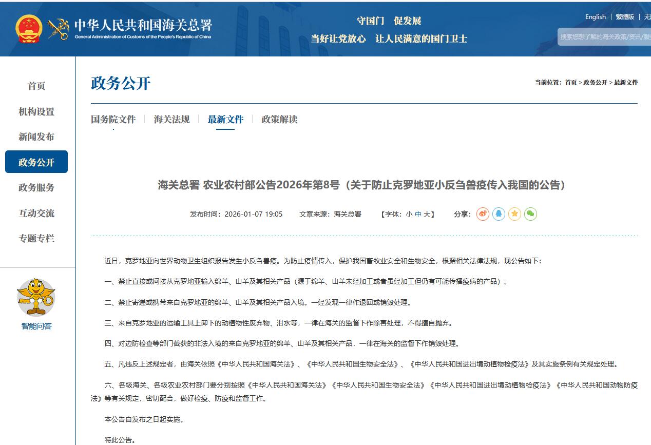 海關(guān)總署 農(nóng)業(yè)農(nóng)村部公告2026年第8號(關(guān)于防止克羅地亞小反芻獸疫傳入我國的公告)