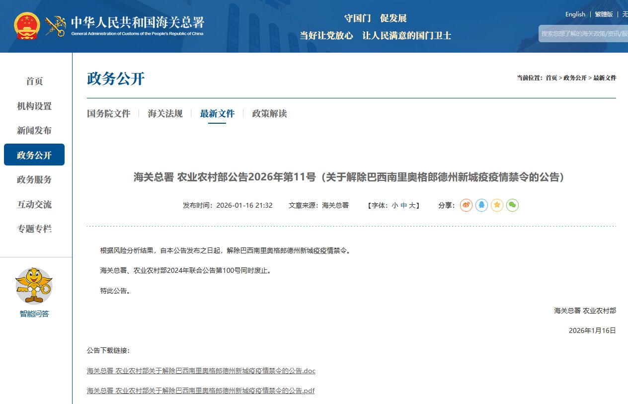 海關(guān)總署 農(nóng)業(yè)農(nóng)村部公告2026年第11號(關(guān)于解除巴西南里奧格郎德州新城疫疫情禁令的公告)