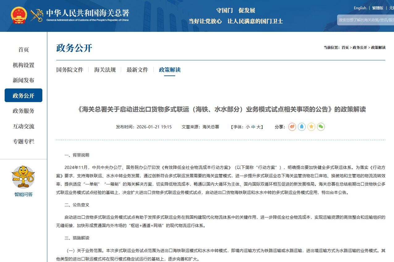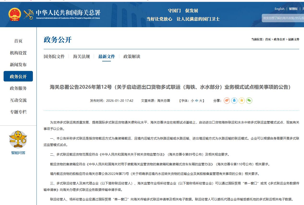 海關(guān)總署公告2026年第12號(關(guān)于啟動進出口貨物多式聯(lián)運(海鐵、水水部分)業(yè)務(wù)模式試點相關(guān)事項的公告)